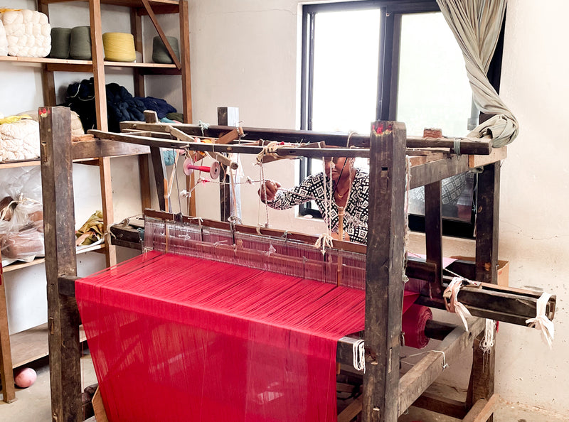 Our partners in India specialize in handicrafts such as textile weaving and block printing. Most recently they created two different batches of custom fabric for us in the double ikat style, a complex hand-loomed weaving technique. The stunning results became a dolly dress and shirt for our Autumnal Essentials Collection.