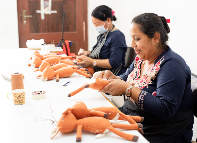 Our partners in Nepal, who make all our dolls and animals, have a social mission to preferentially hire survivors of trauma or discrimination. They provide job training, personal development programs, fair wages, and (delicious) breakfast and lunch every day. Each time we visit, we can tell that love and consideration permeate all they do.